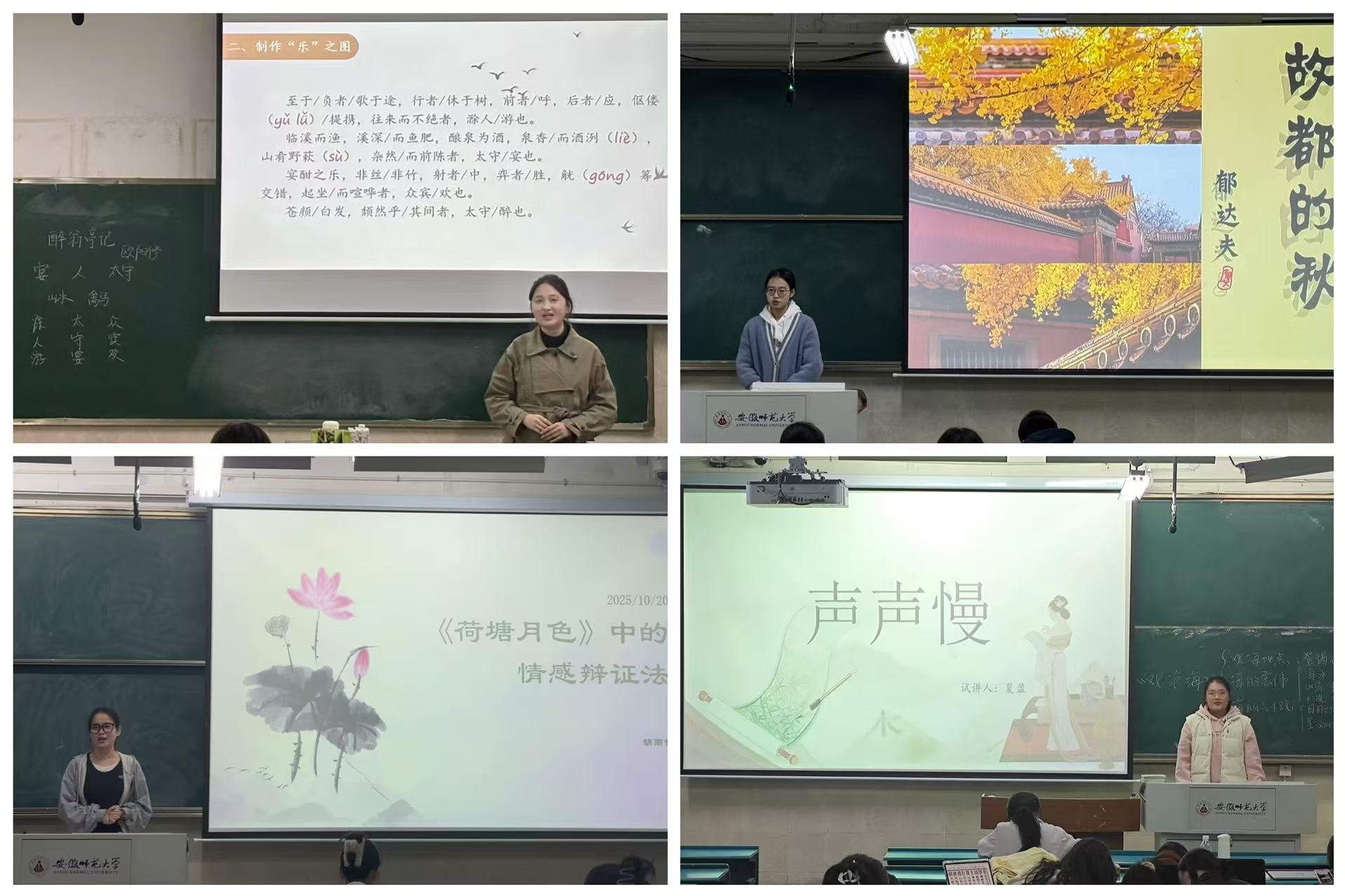 训练活动中,同学们根据个人兴趣和专长,选择了多样化的教学内容。不少同学从中小学语文教材中选取经典课文进行讲解:朱自清的《荷塘月色》成为热门篇目之一,试讲同学通过创设情境,引导大家品味月色下的荷塘美景,分析比喻、通感等修辞手法的运用;古典诗词同样备受青睐。讲解李白的《将进酒》时,有同学通过范读再现诗歌的豪放气魄;解读曹操的《短歌行》时,有同学则着重剖析诗歌中的意象与诗人求贤若渴的情怀。这些尝试展现了同学们对古诗词韵律和意境美的把握能力。在教学方法上,同学们大胆创新。有的采用歌曲导入新课,有的通过声情并茂的朗诵带动课堂氛围,有的则设计互动问答激发学习兴趣。这些方法既丰富了试讲形式,也为未来教学实践积累了经验。