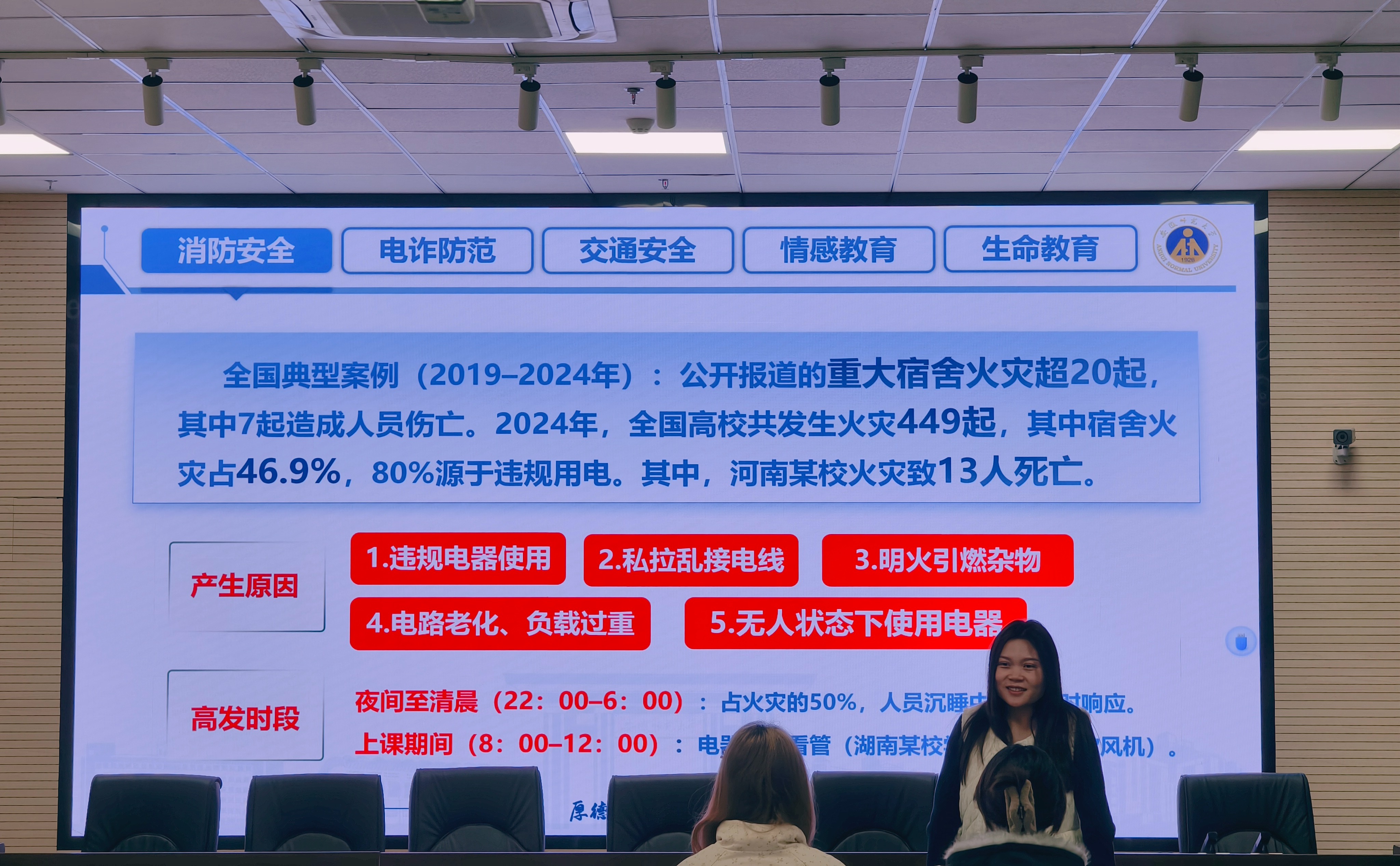 唐宇晴老师首先结合近期高校典型案例,强调了宿舍消防安全的重要性。她指出,冬季违规使用大功率电器是引发火灾的主要原因,提醒同学们务必遵守学校用电规定,做到“人离电断”,并掌握初期火灾扑救与应急疏散的基本方法。
