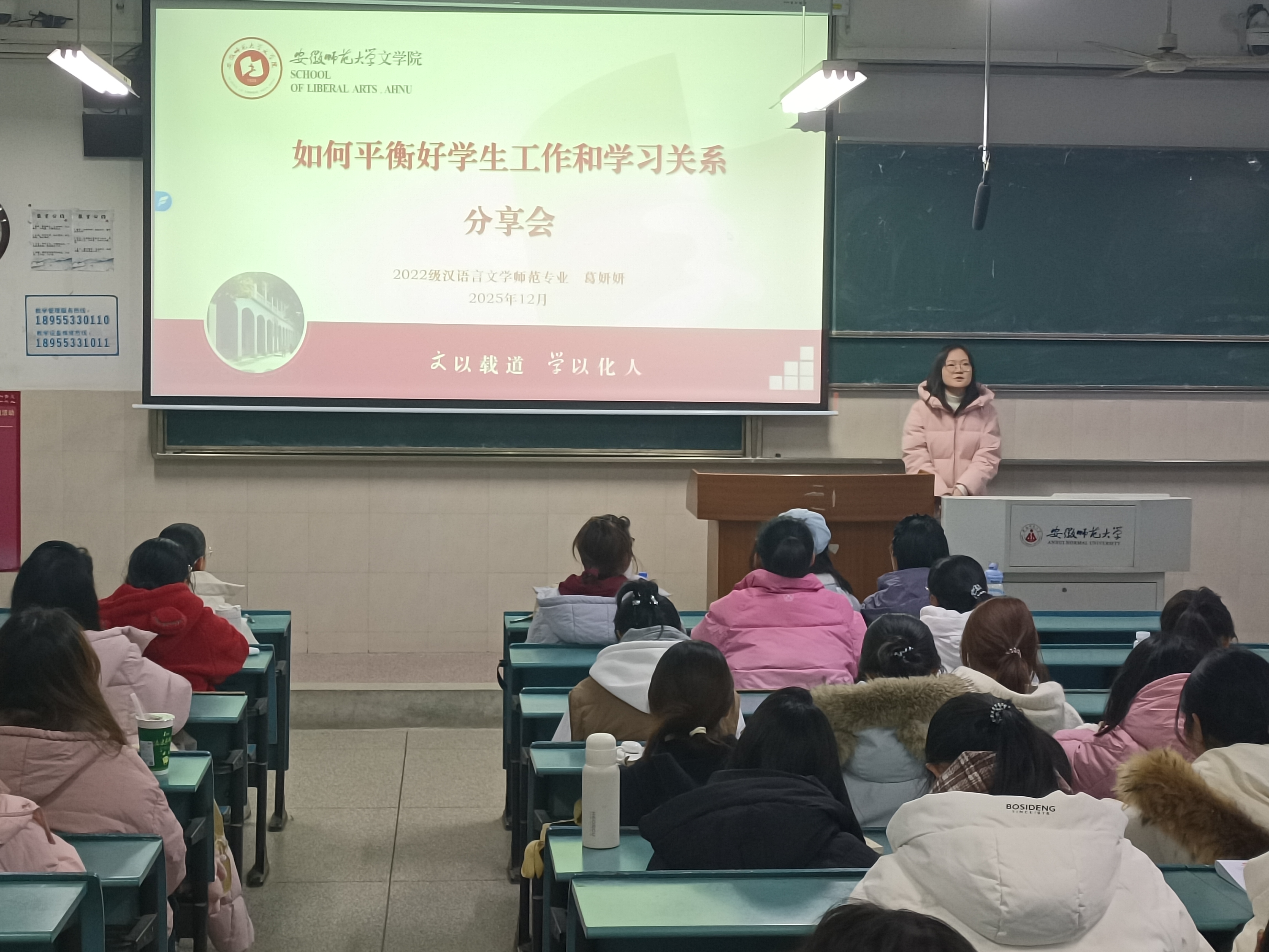 为充分发挥优秀毕业生的朋辈引领作用,引导新生树立远大理想、科学规划大学生活,2025年12月17日晚,2025级汉语言文学专业“优秀学生干部成长修炼手册”主题经验分享会在行知楼2020201成功举办。本次分享会特邀已推免至南京师范大学的2026届优秀毕业生葛妍妍同学担任主讲,吸引了2025级全体新生班委及众多对成长规划充满热情的同学积极参与,现场座无虚席,反响热烈。