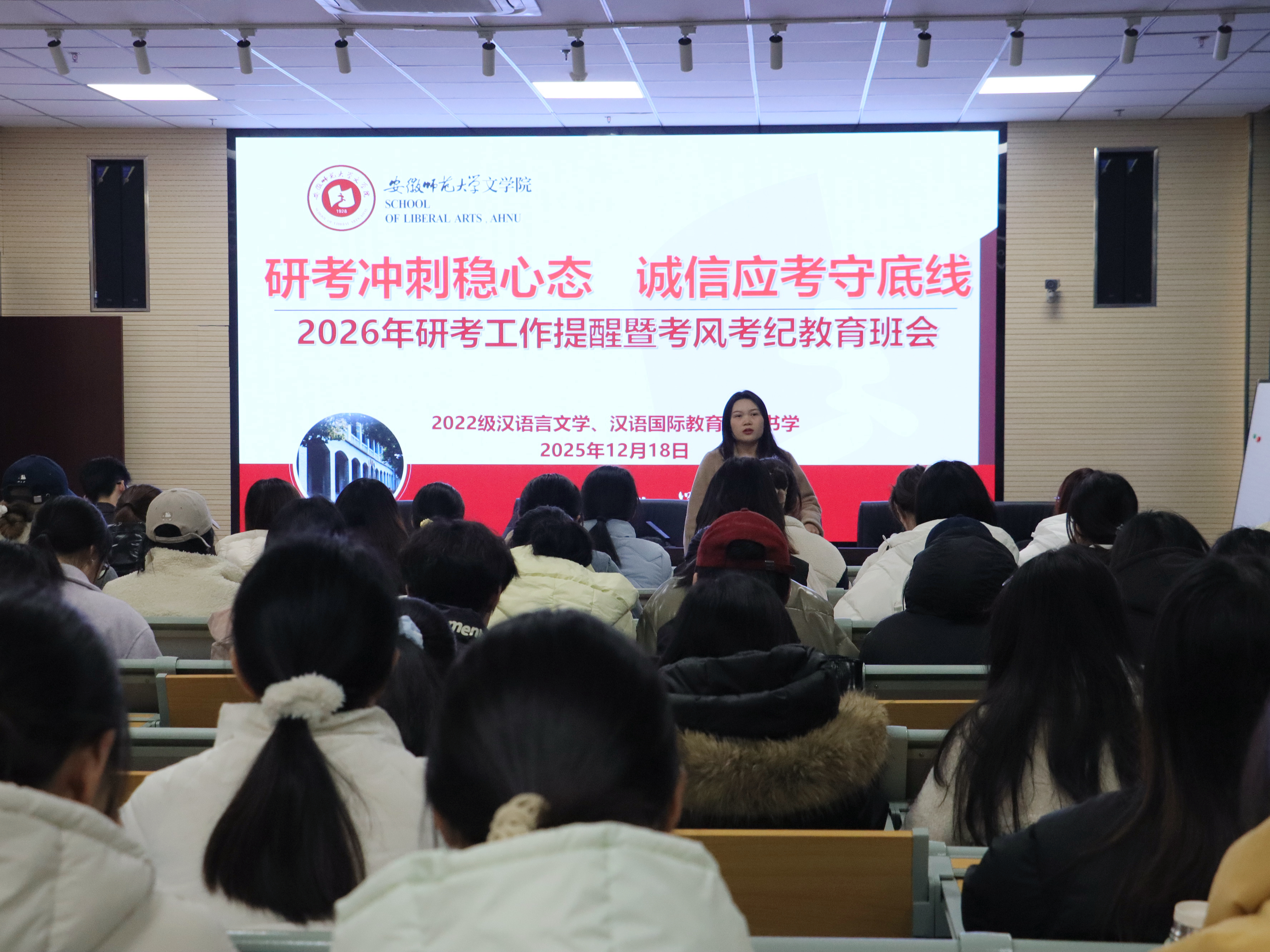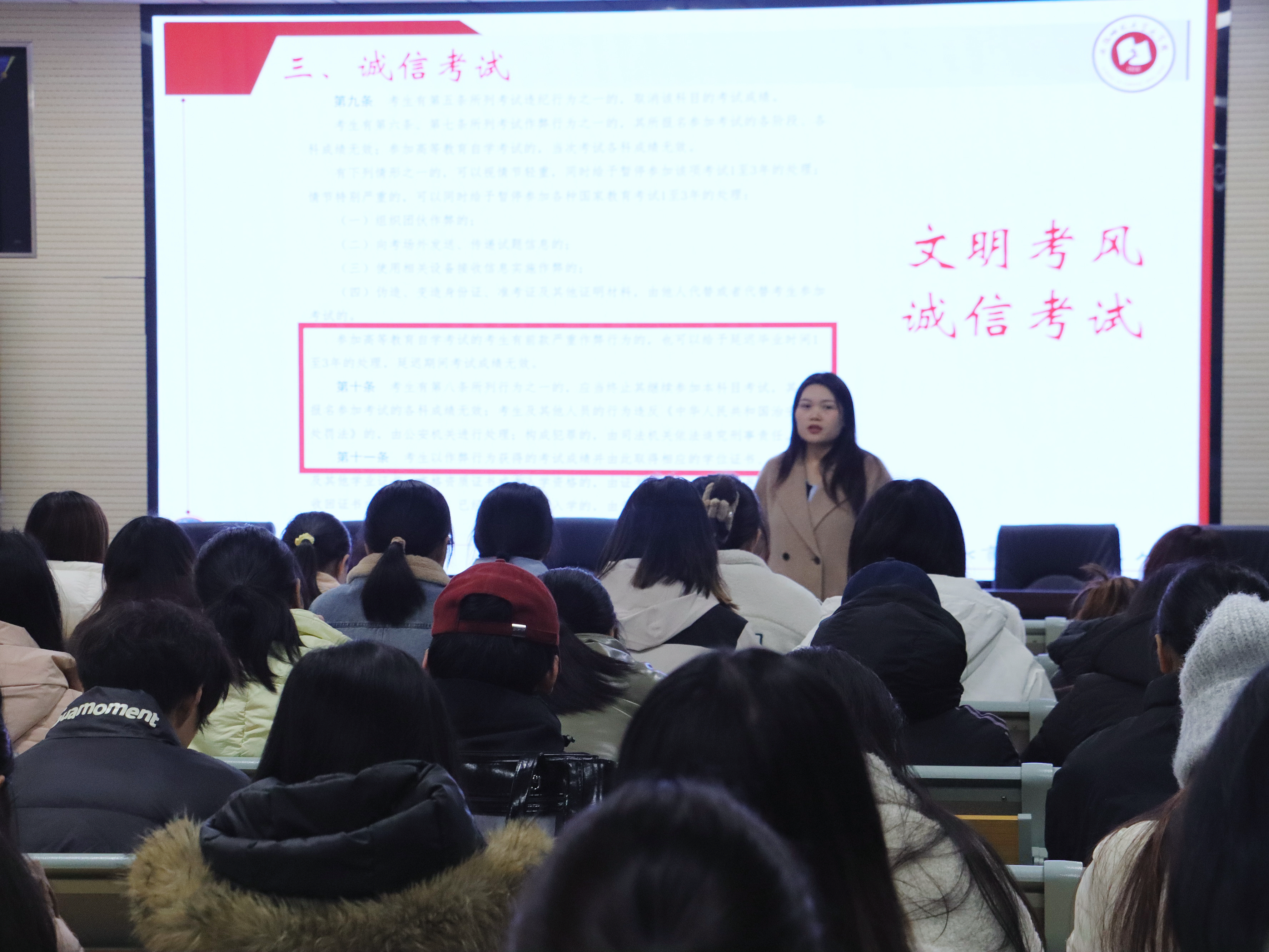 为切实保障2026年研究生考试平稳有序进行,强化同学们的规则意识与诚信观念,帮助大家以良好状态迎接考试,12月18日晚,22汉非、汉教、秘书学专业于文典楼F108报告厅顺利开展研考工作提醒暨考风考纪教育主题班会。班会由辅导员唐宇晴和付恩波主持,全体同学参会。