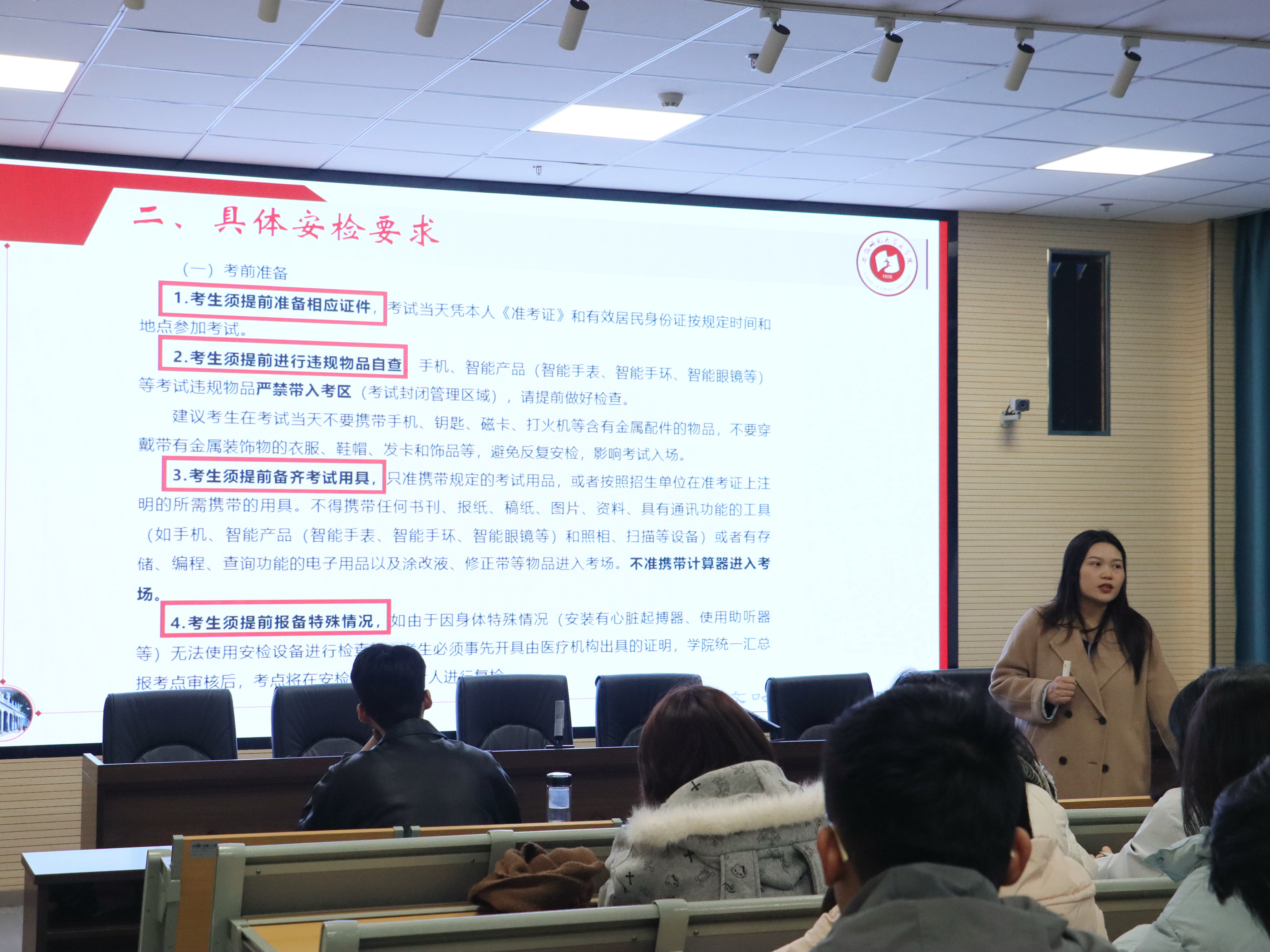 会上,唐宇晴围绕考场分布、入场安排和安检注意事项等进行了详细讲解,要求同学们务必提前登录研招网下载打印准考证,仔细研读报考点说明,精准确认每场考试的具体地点,建议提前实地踏勘考场路线,预留充足出行时间,避免因路线不熟、考场混淆影响考试。在入场及安检要求环节,唐宇晴结合教育部及安徽省相关文件精神,对安检流程、时间及禁忌事项进行重点解读,要求同学们合理规划出行时间,提前抵达考区有序排队配合安检。针对安检具体要求,她作出四点明确规定:一是证件齐全,二是违规物品严禁带入,三是减少金属物品干扰,四是特殊情况提前报备。随后,围绕同学们所关心的安检流程和个人特殊情况等,现场做出了一一解答。