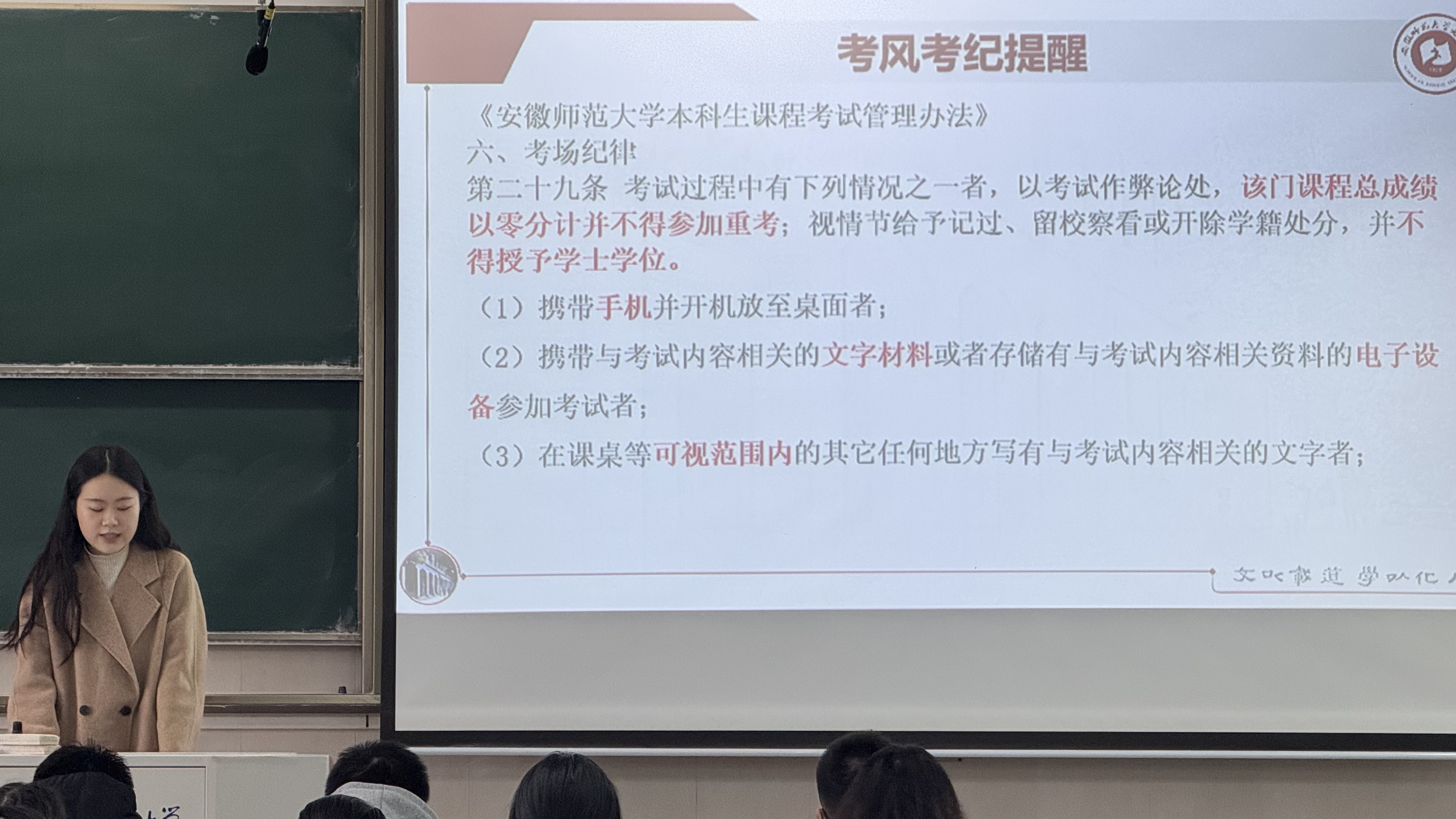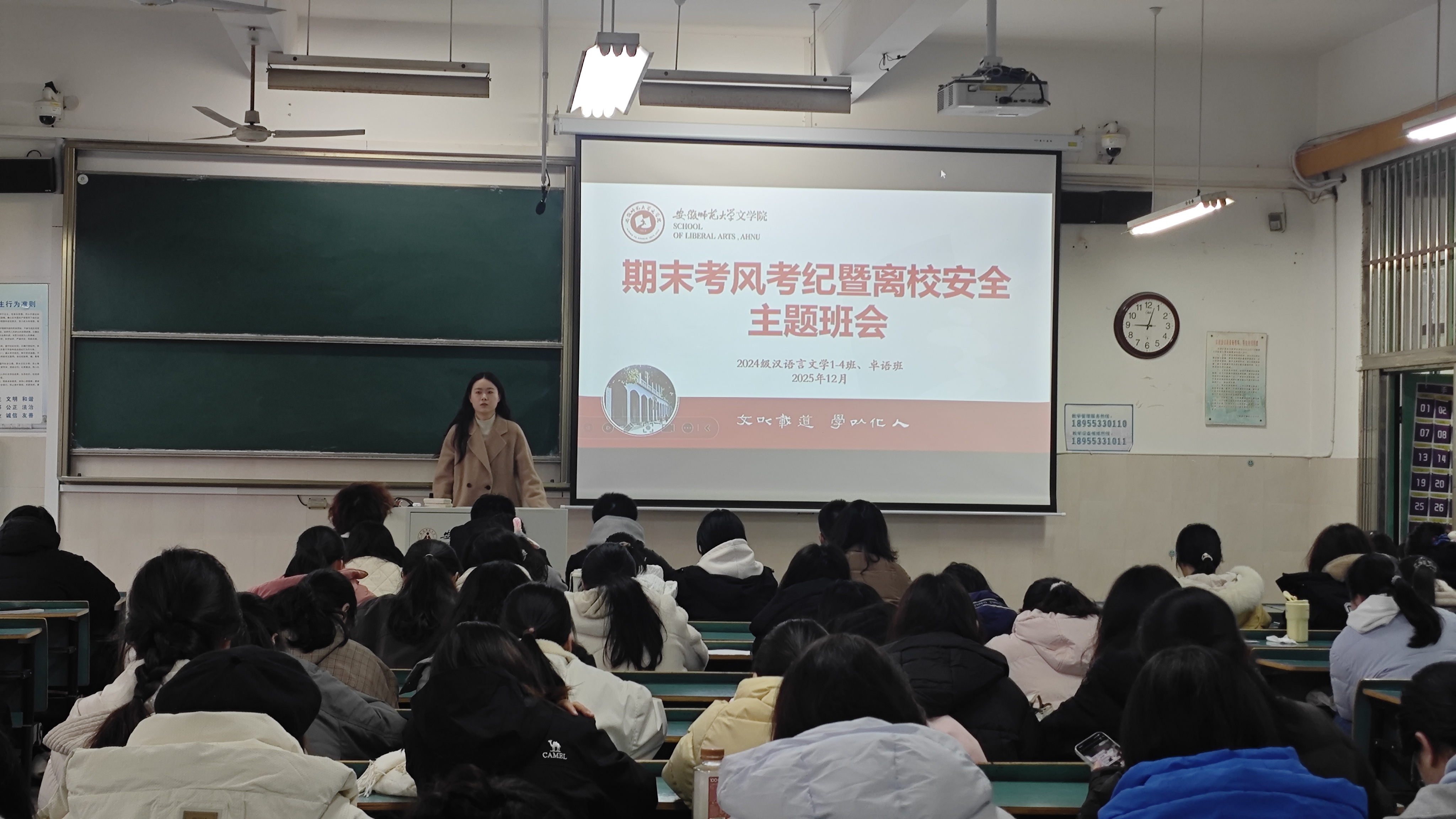 临近期末,为引导学生树立诚信意识、严肃考场纪律,同时做好假期离校安全教育工作,12月24日,2024级汉语言文学1-4班、卓语班在行知楼教室组织召开了“期末考风考纪暨离校安全”主题班会。班会由辅导员主持,全体同学参加。