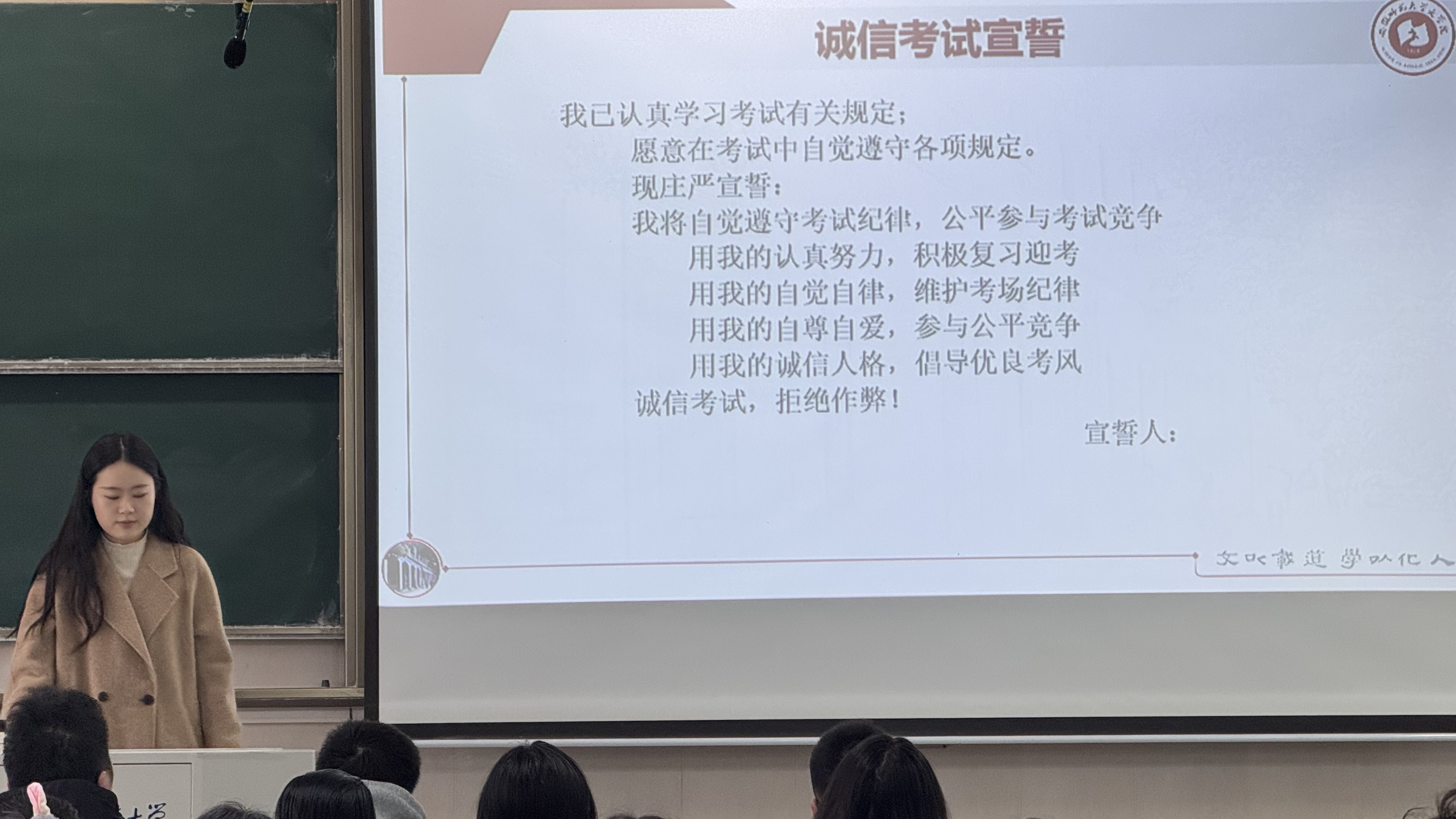 班会伊始,杨老师强调了诚信考试的重要性,指出“考试虽重,诚信事大”,并带领同学们共同学习了学校学生手册中关于考场纪律和违纪行为的认定与处理规定。杨老师结合真实案例,提醒同学们严格遵守考场纪律,杜绝任何形式的作弊行为,并带领全班同学共同宣誓,树立“诚信为本、踏实应考”的端正态度。同时提醒同学们注意科学备考,劳逸结合,正确看待考试成绩。