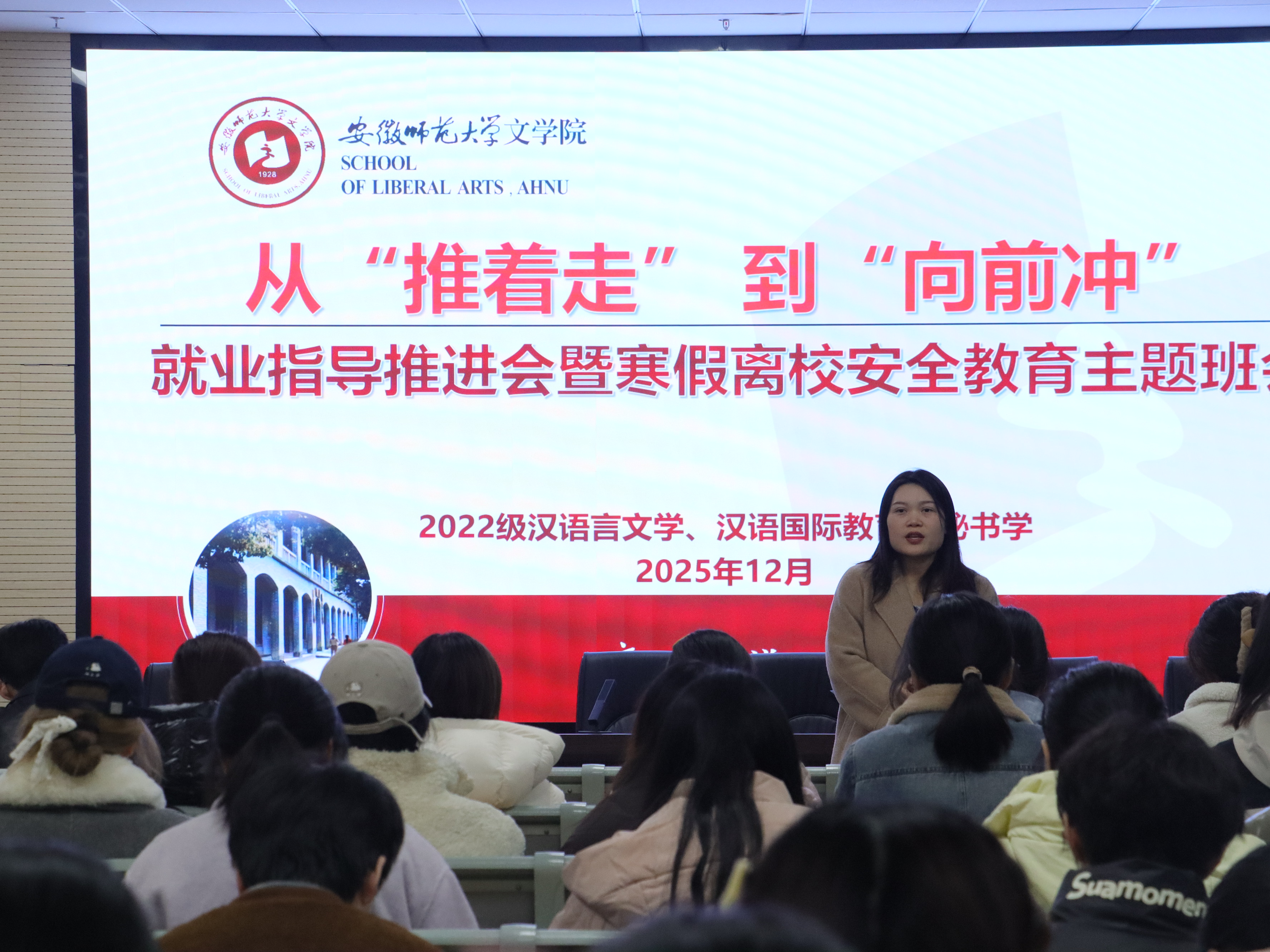 为精准对接毕业生就业需求,扎实做好寒假安全管理工作,2022级汉语言文学(非师范)、汉语国际教育、秘书学专业于12月31日召开就业指导推进会暨寒假离校安全教育主题班会。本次班会由辅导员唐宇晴主持,全体同学参会。