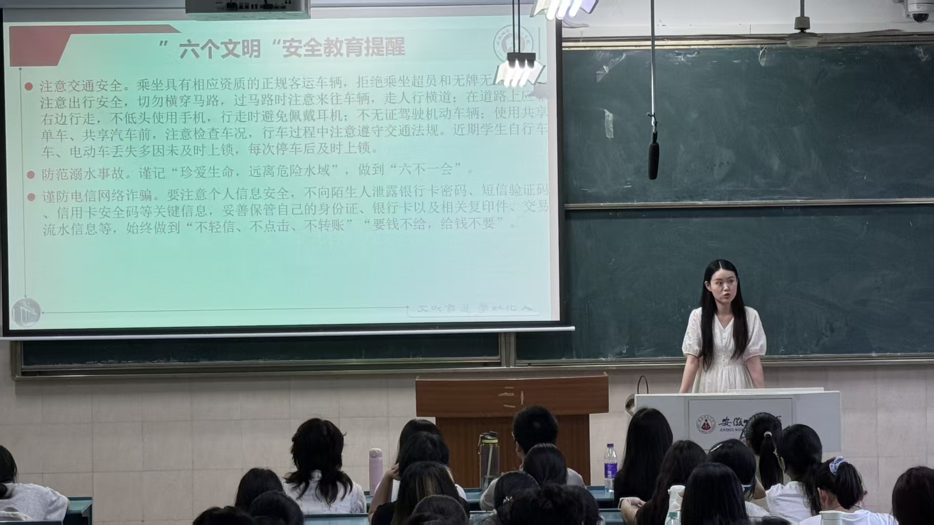 班会伊始,杨玉婷老师对2024级本科生导师制双选工作进行了详细说明,并希望同学们主动根据自己未来的论文方向积极选择老师。并就近期学生工作和班级学风问题进行了提醒。接下来,杨老师再次明确了“严禁擅自离校、严禁私自租房、严禁晚归不归、严禁违规电器”四项禁令,要求同学们认真了解《安徽师范大学学生违纪处分规定》。同时,从“六个文明”安全教育角度,对交通安全、防溺水、电信网络诈骗、政治与网络安全、防范自然灾害、消防安全等方面进行了细致讲解,提醒同学们守牢安全底线。尤其针对电信网络诈骗,杨老师结合近期大学生被骗案例,如虚假网络婚恋交友诈骗、刷单返利诈骗等,提醒同学们要提高警惕,做到“不轻信、不点击、不转账”“要钱不给,给钱不要”,切勿下载来历不明的非正规APP。