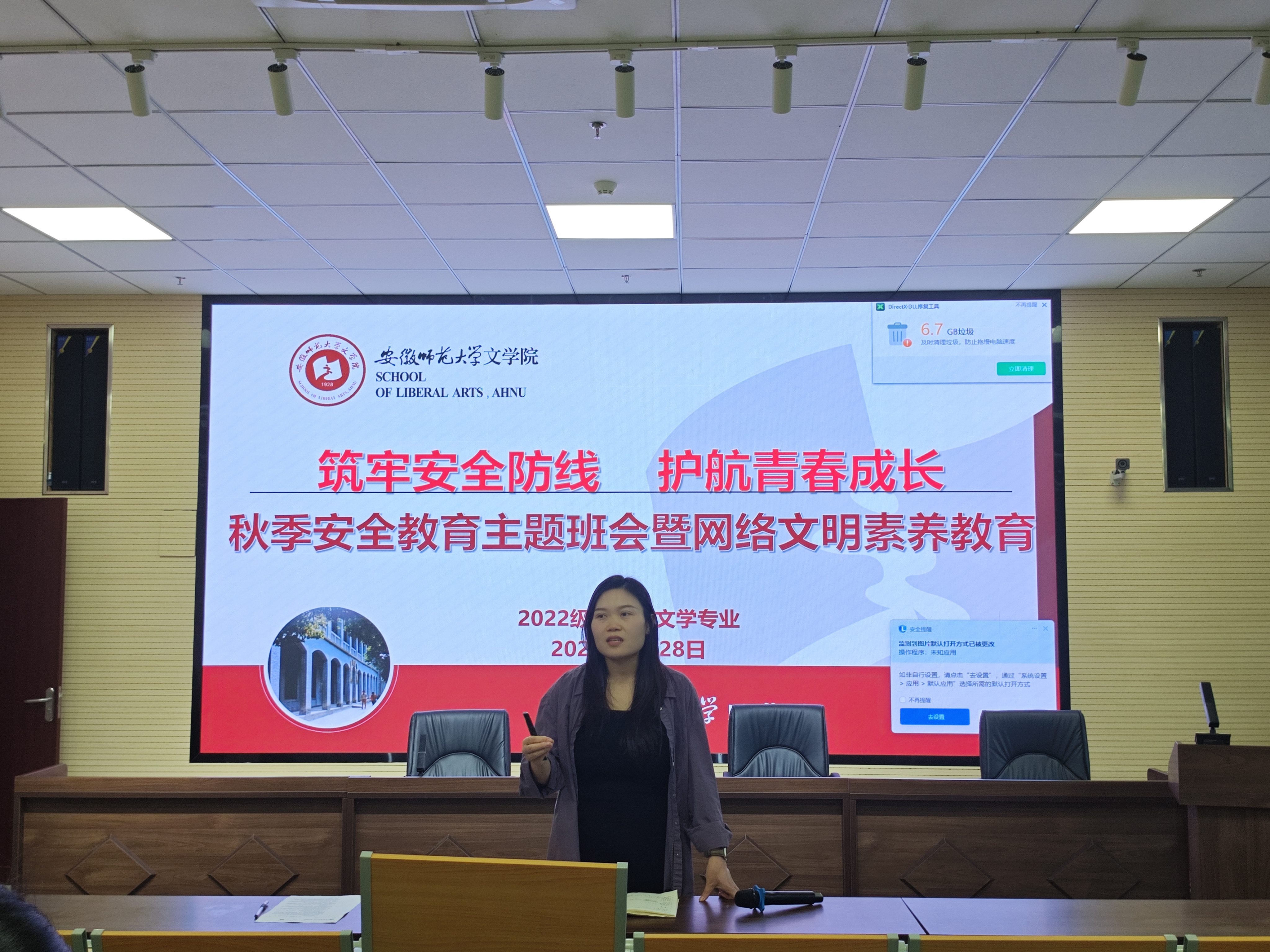 国庆假期将至,为切实增强学生安全防范意识与网络文明素养,筑牢校园安全防线,保障各位同学度过一个平安、充实、文明的假期,9月28日下午,2022级汉语言文学(非师范)专业于文典楼F108报告厅召开以“筑牢安全红线,护航青春成长”为主题的秋季安全教育主题班会暨网络文明素养教育活动,本次班会由辅导员唐宇晴主持,全体同学参会。