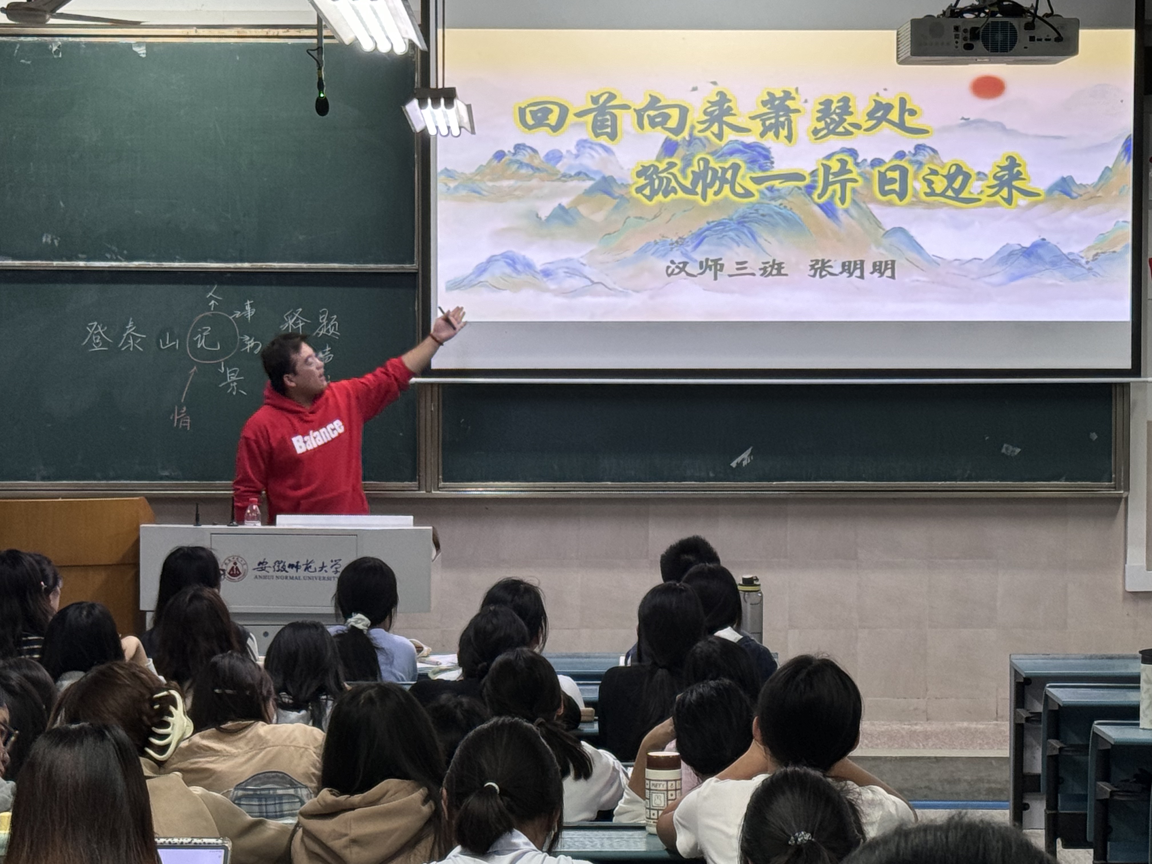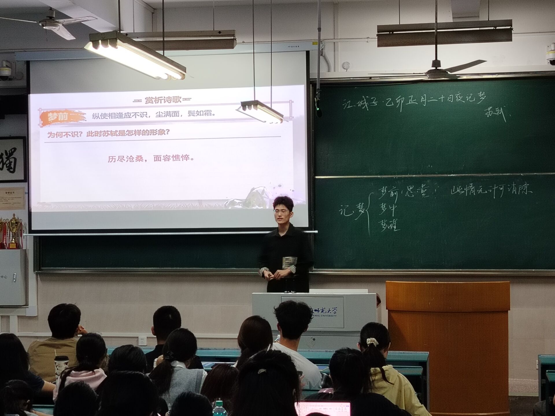刘瑞祺学长以苏轼的《江城子·乙卯正月二十日夜记梦》为例,进行了一场富有感染力的试讲示范。他的课堂注重情感氛围的营造,通过富有节奏的朗诵、对重点字词的精细处理,引导学生体会词作的孤寂感与深切怀念。在经验分享环节,他特别强调,备赛需抓住文本的核心闪光点,课件制作应简洁凝练、图文相辅而非喧宾夺主,同时提醒大家要注重教姿教态,保持自信微笑,做到眼里有学生。