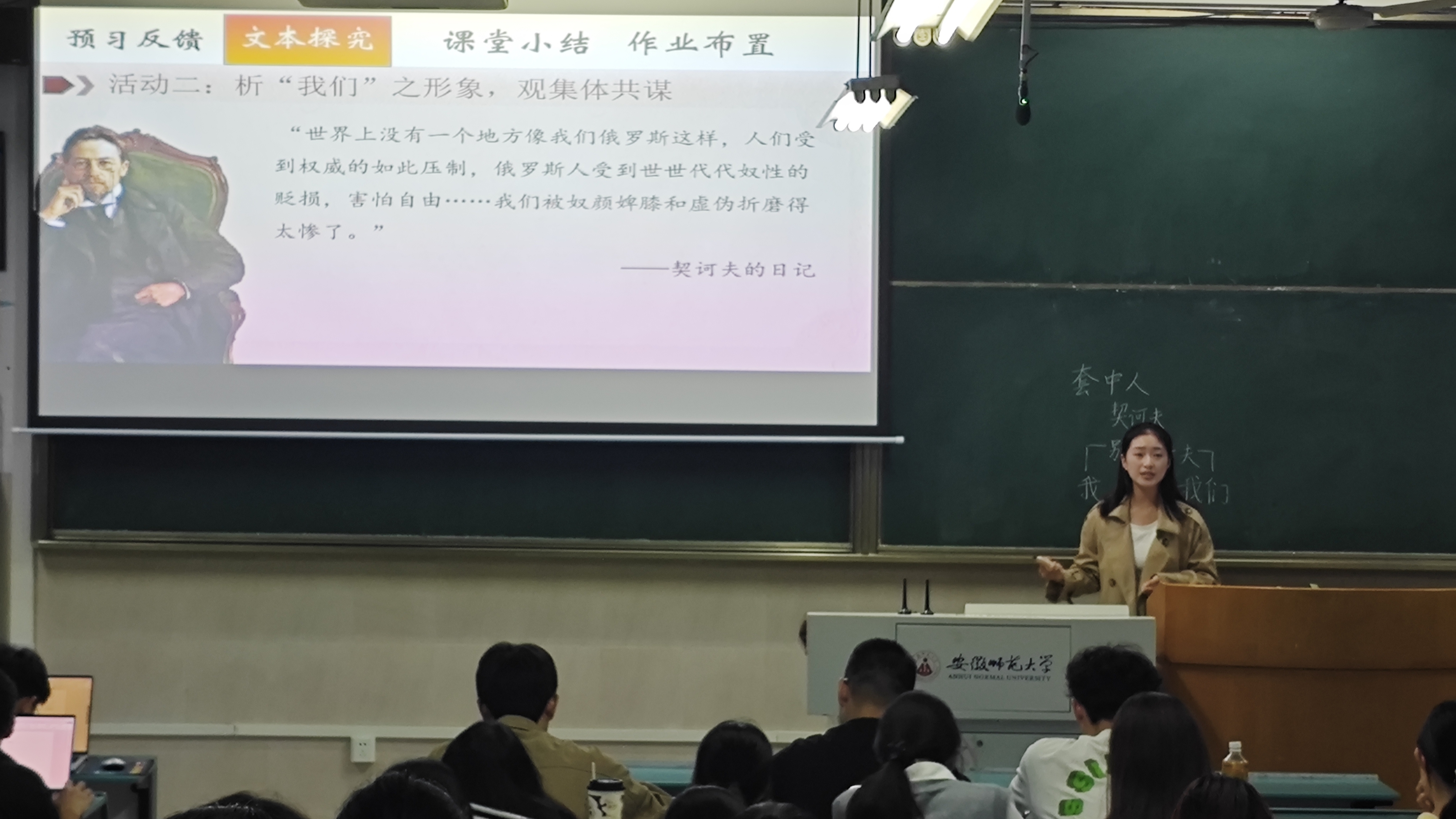 方润瑶学姐则以《装在套子里的人》为例,系统阐述了从“模仿”到“创造”的成长路径。她建议同学们积极利用“国家中小学智慧教育平台”等优质资源,精细观摩名师课堂,重点关注教学环节的衔接以及板书和作业的设计。在备课方面,她指出需深入研究教材与教师用书,树立“大单元”教学意识,并不断提升文本解读能力,学会从“小切口”引出“大问题”。她还鼓励大家通过录制视频、利用智慧教室等方式进行自我复盘,逐步形成个人独特的教学设计与风格。
