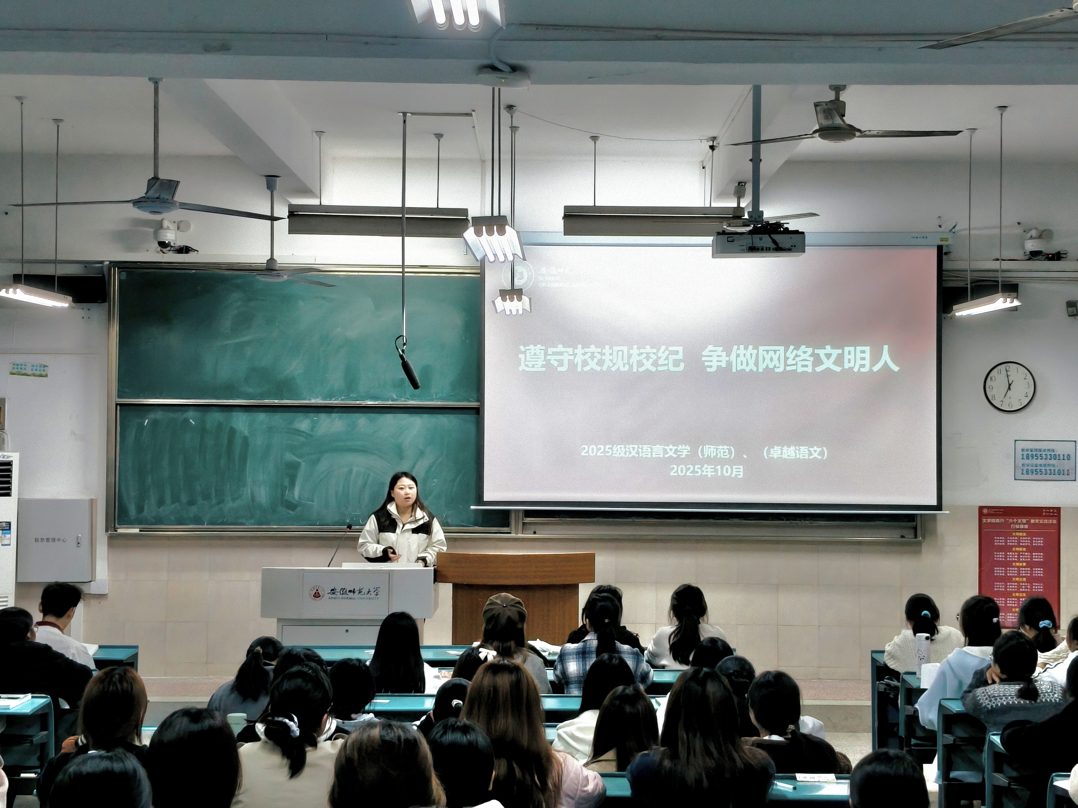 为帮助新生适应大学校园生活,增强纪律观念与网络安全意识,引导其扣好大学阶段的“第一粒扣子”,10月22日,2025级汉语言文学(师范)专业各班级召开了以“学习校规校纪,争做网络文明人”为主题的入学教育班会,班会由辅导员吴佳惠主持。