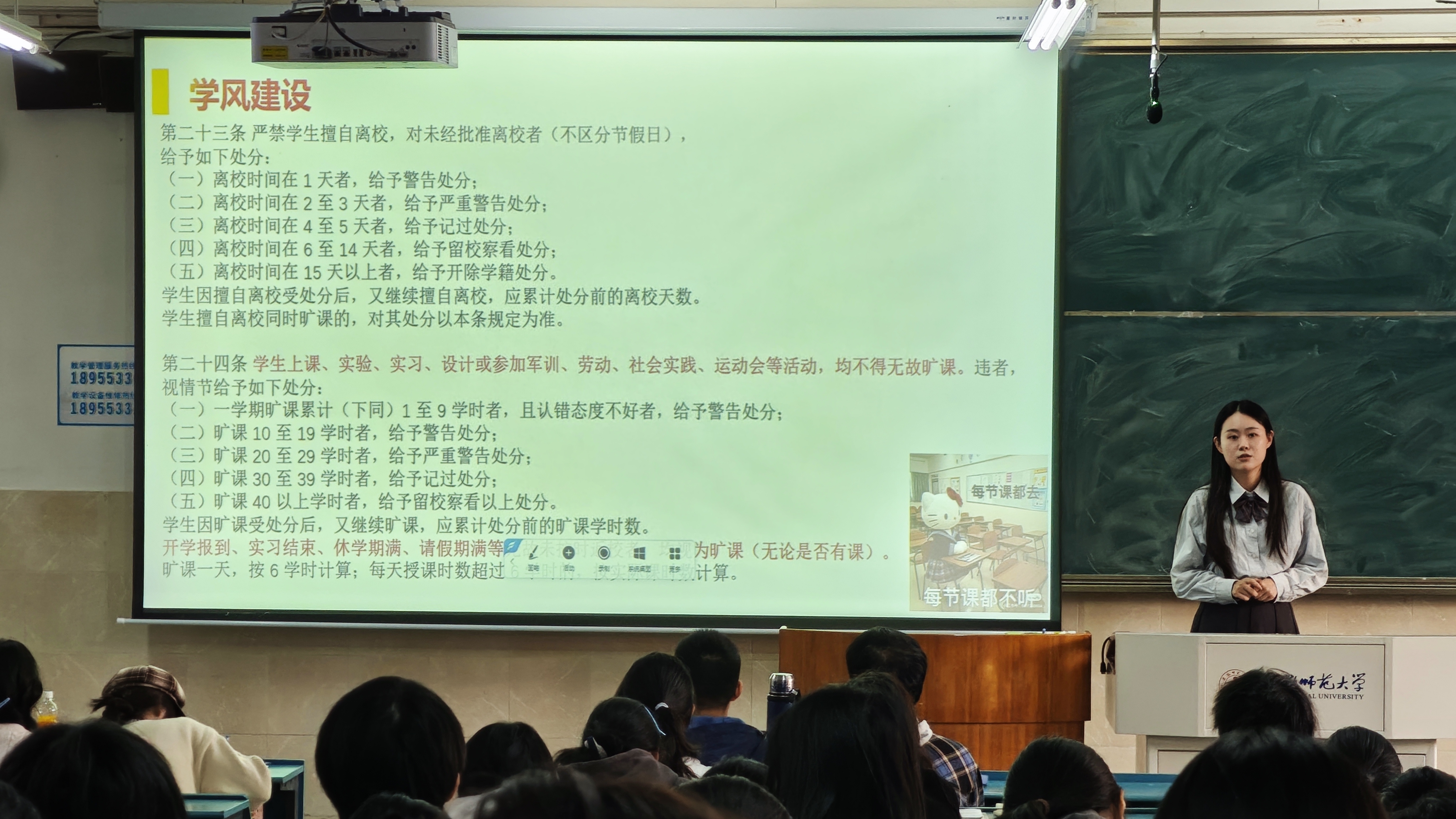 在学风建设方面,杨玉婷老师直面“不想学、不要学、不会学”的学风痛点,结合《安徽师范大学学生手册》和鲜活的案例,细致解读旷课、擅自离校等行为的处分细则,警示同学们重视班风学风,抓住大二这一关键学年。同时,她深刻剖析“精致利己主义”的表现与危害,引导大家摆脱功利心态,树立集体意识与社会责任感,倡导“如果不知道该干什么,那就好好上课,按时上好每一节课”的学习理念。并就近期奖助学金、运动会、师范生技能训练等日常班级事务和校园活动进行了说明动员。