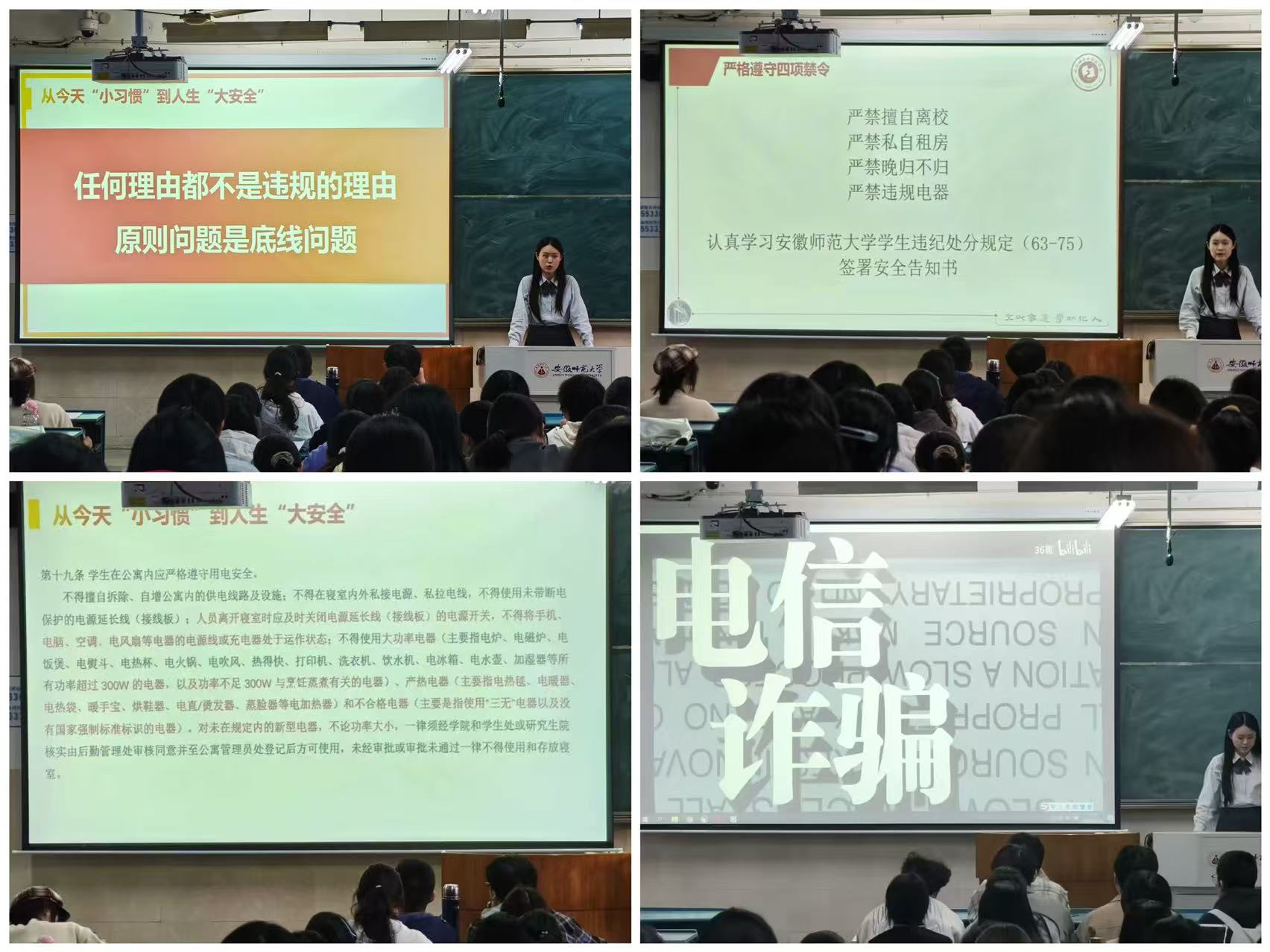 安全教育环节,杨老师围绕寝室安全文明教育、防范电信网络诈骗、交通安全、网络安全、校规禁令等展开,并压实寝室长责任,通过寝室这个小单位让安全问题落小落细。针对寝室安全文明教育,她明确违规电器类型与用电规范,强调“任何理由都不是违规的理由,原则问题是底线问题”;在防电信网络诈骗上,以“给钱不要!要钱不给!”的警示语,提醒大家诈骗手段层出不穷一定警惕各类诈骗手段,及时和老师家人朋友进行确认和沟通;同时学会用适当的方式表达诉求,注意网络安全。再次强调“严禁擅自离校、私自租房、晚归不归、违规电器”四项禁令,组织大家学习处分规定,将安全意识融入日常。