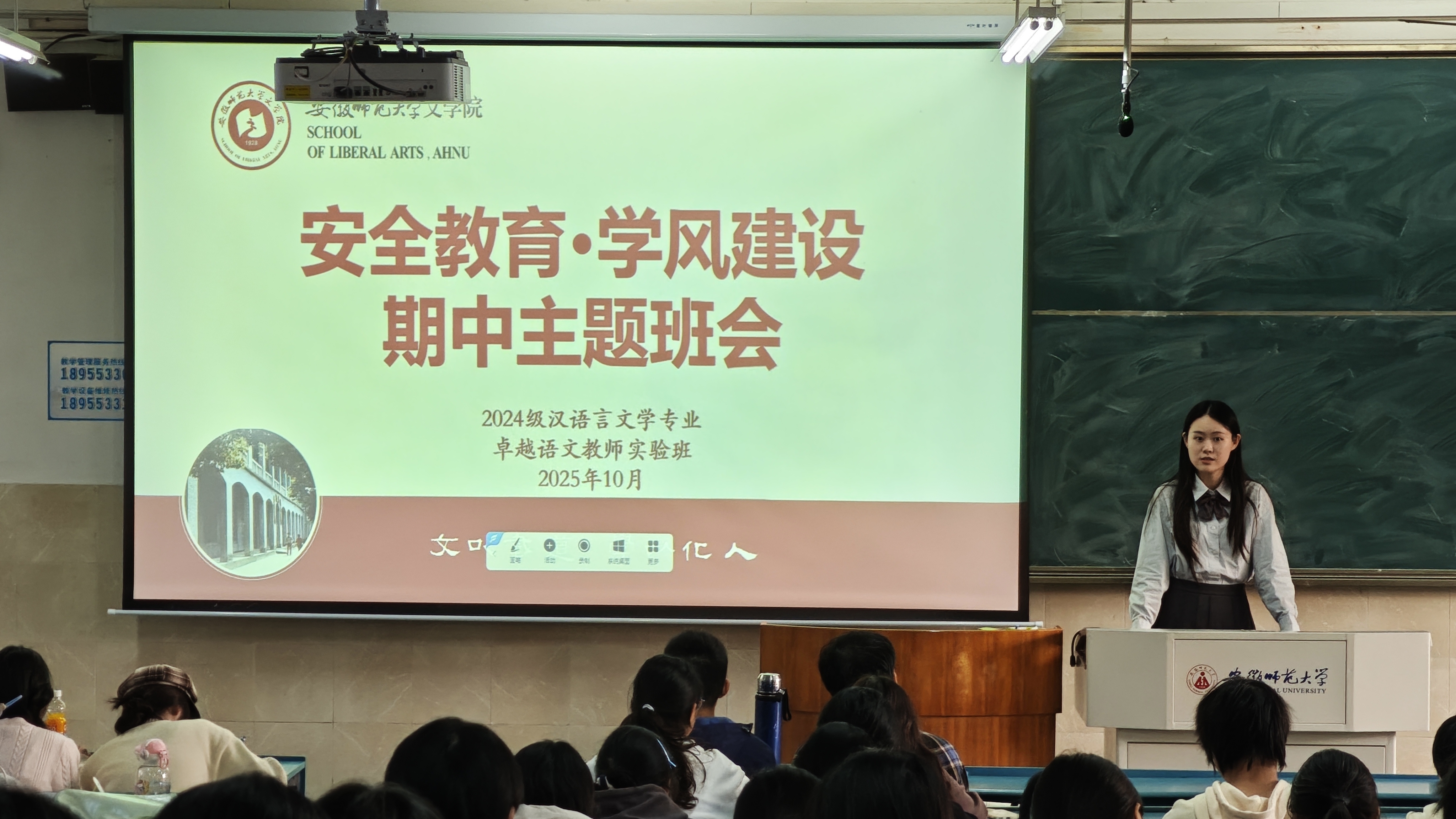 为强化学生安全意识、推进优良学风建设,10月28日下午,文学院2024级汉语言文学1-4班及卓语班在行知楼2010103教室,召开“安全教育·学风建设”期中主题班会,班会由辅导员杨玉婷老师主持,全体同学参加。