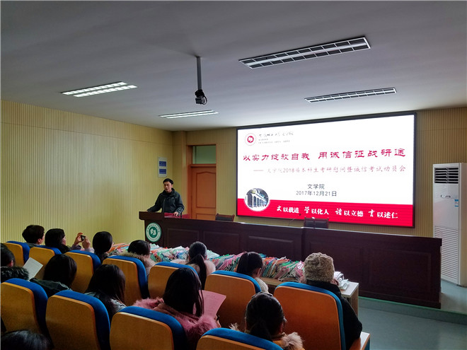 12月21日下午,文学院2018届本科生考研慰问暨诚信考试动员会在学院行政楼三楼报告厅举行,院党委书记余大芹、党委副书记戴和圣、副院长俞晓红,毕业班辅导员杨穆龙、朱露露、徐雅萍,以及全体2014级考研学生参加了本次动员会。